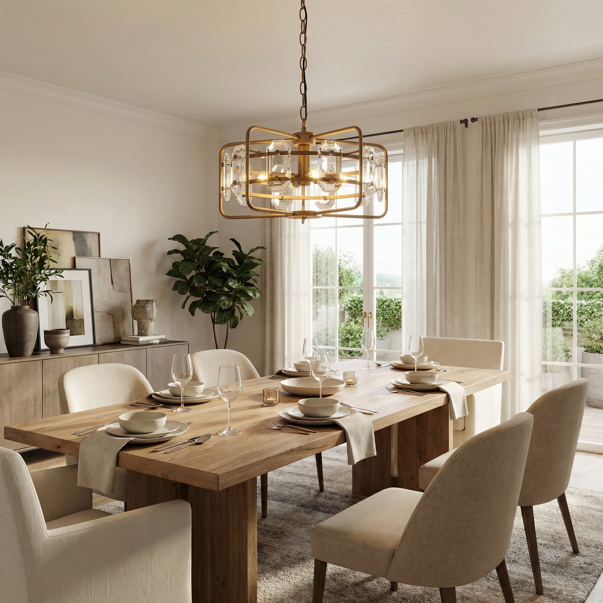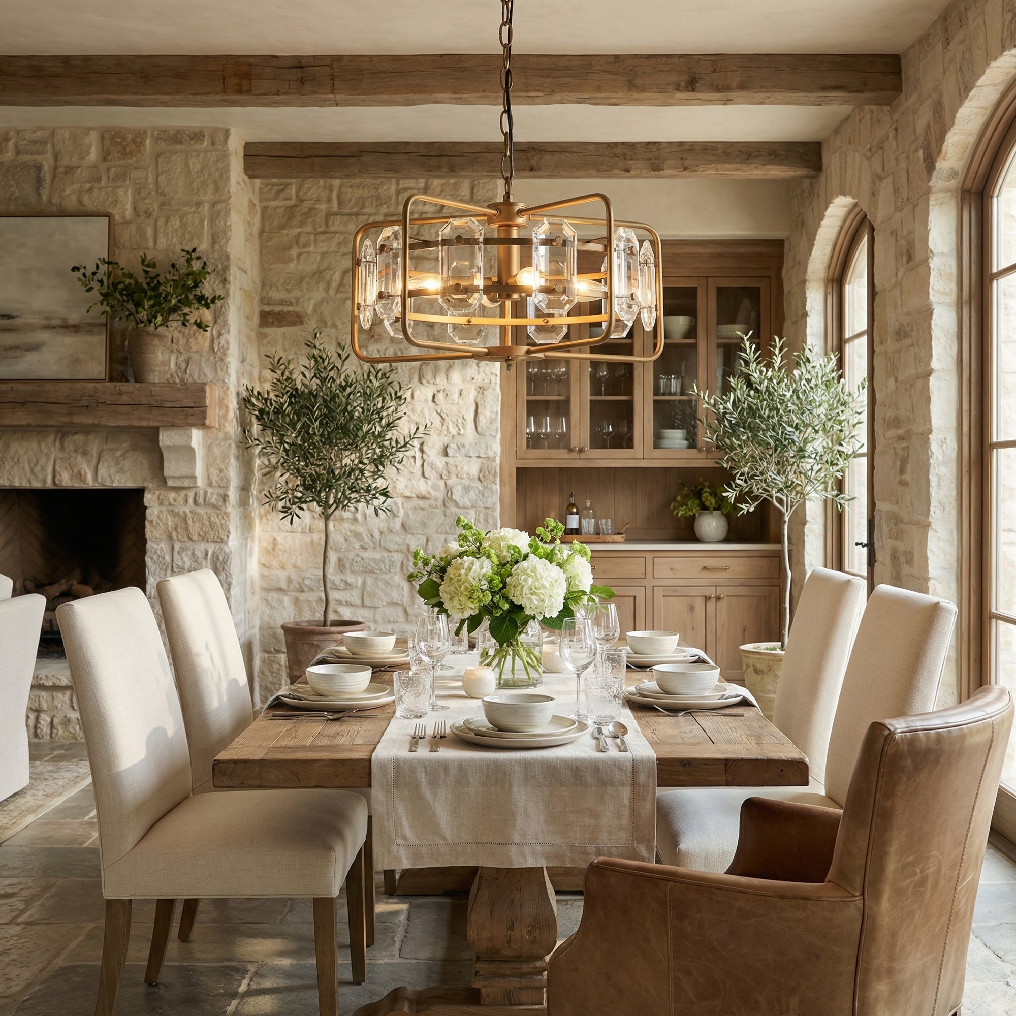 Our dining room chandeliers blend sculptural form with practical comfort. Slender brass arms, turned wood hubs, and stone accents set a balanced silhouette; opal globes or linen shades erase glare. A linear chandelier suits long tables and open-plan rooms; a round frame gathers a square space without blocking sightlines. Everything dims from lively brunch bright to candle-low, so your “modern dining chandelier” feels tailored every night of the week.