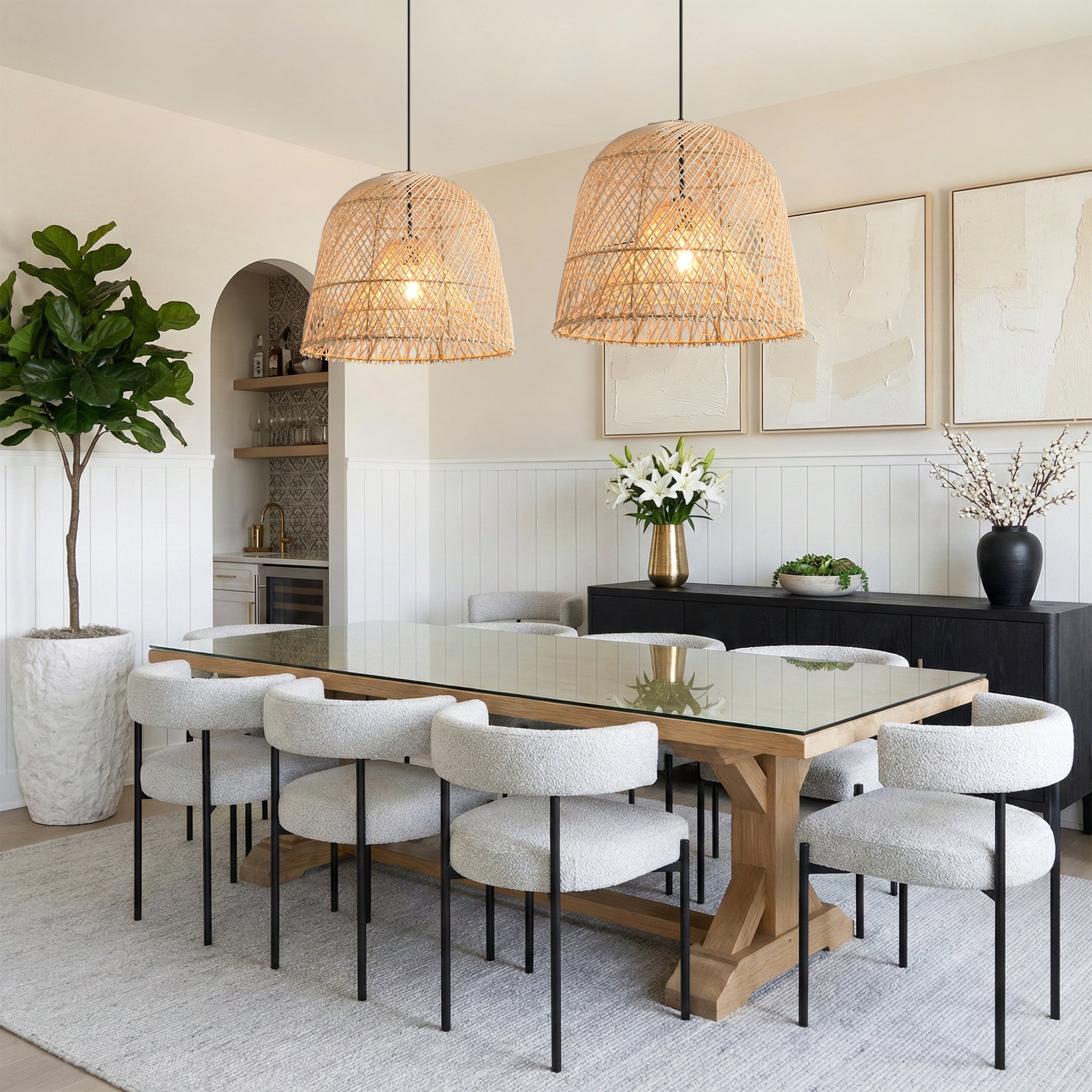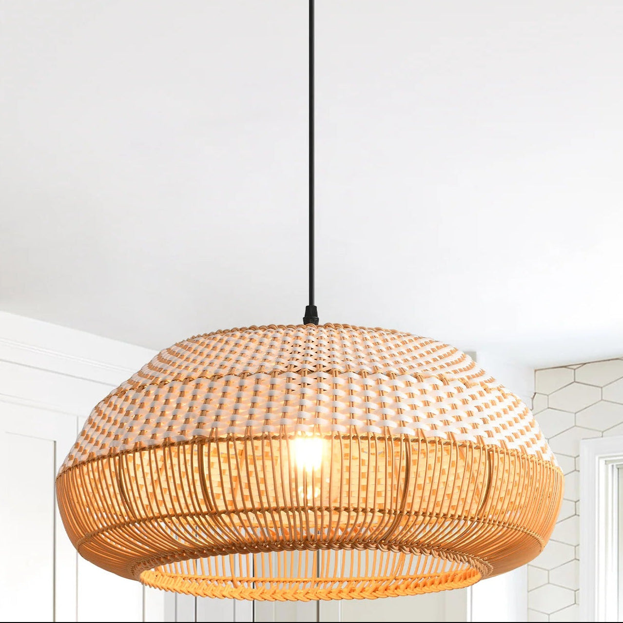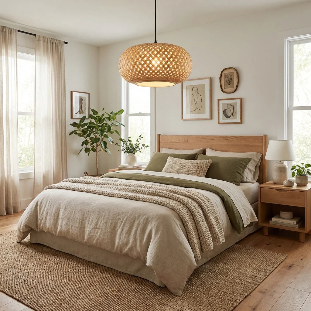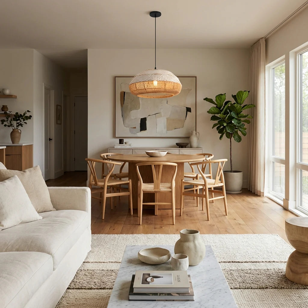 A good kitchen pendant defines the task zone while keeping sightlines open. Our hand-spun domes, linen or rattan drums, and stone-collar globes deliver clean downlight with a gentle halo at the rim—perfect for an island, a breakfast nook, or an entry into the cook space. Adjustable drops, tidy canopies, and sloped-ceiling hardware keep installs straightforward. Pair two medium pendants for even prep light or choose one linear profile when you want a calm, contemporary look. High-CRI, dimmable LEDs (2700–3000K) keep food tones and wood grain honest.