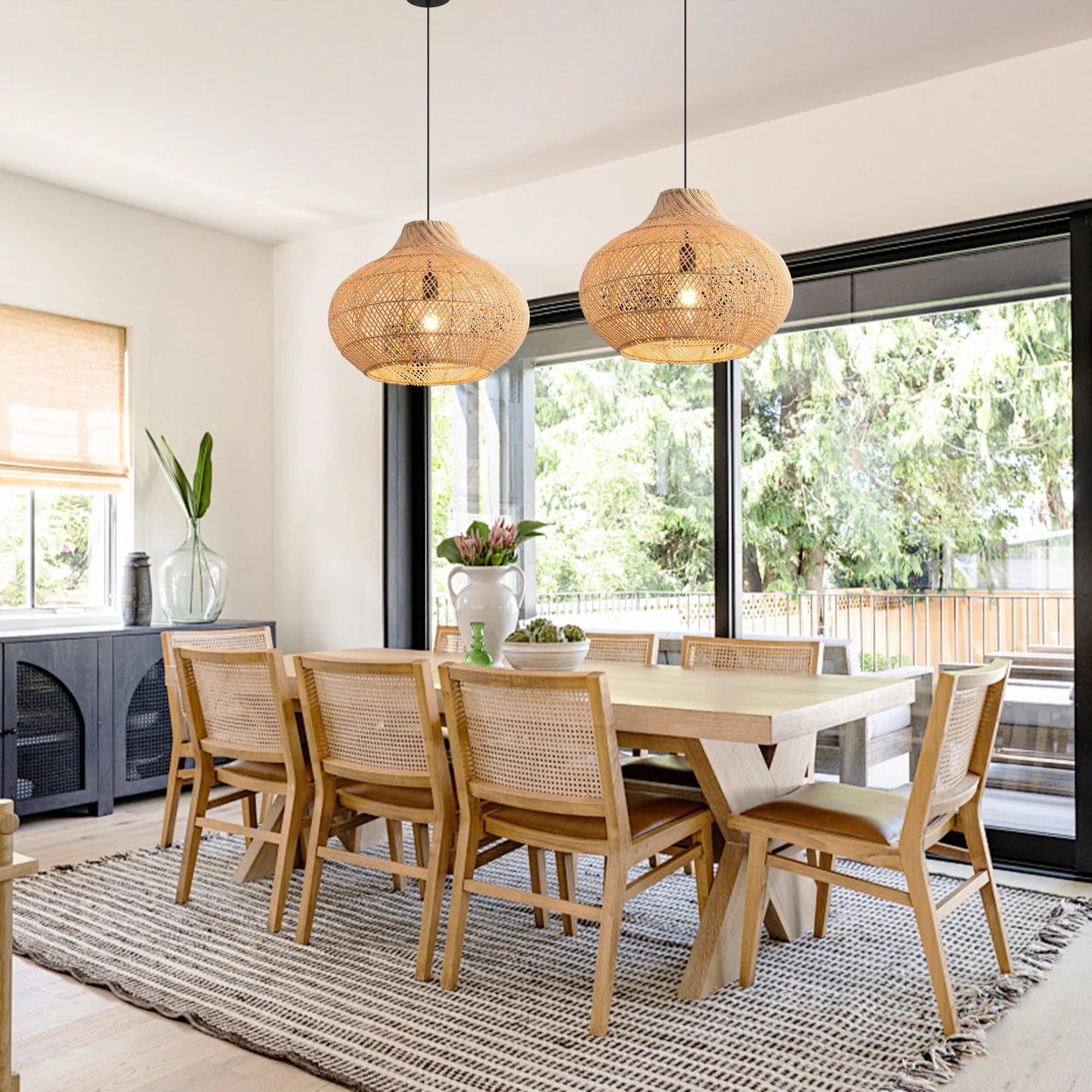 Finish sets the mood without shouting. Brushed brass warms stone and wood; matte black sharpens contemporary palettes; natural oak introduces soft, Scandinavian character; handwoven rattan brings a breezy, coastal note; stone accents add quiet luxury. Pair two medium pendants over a long island, or center one larger profile over a dining table for an anchored, considered look.
