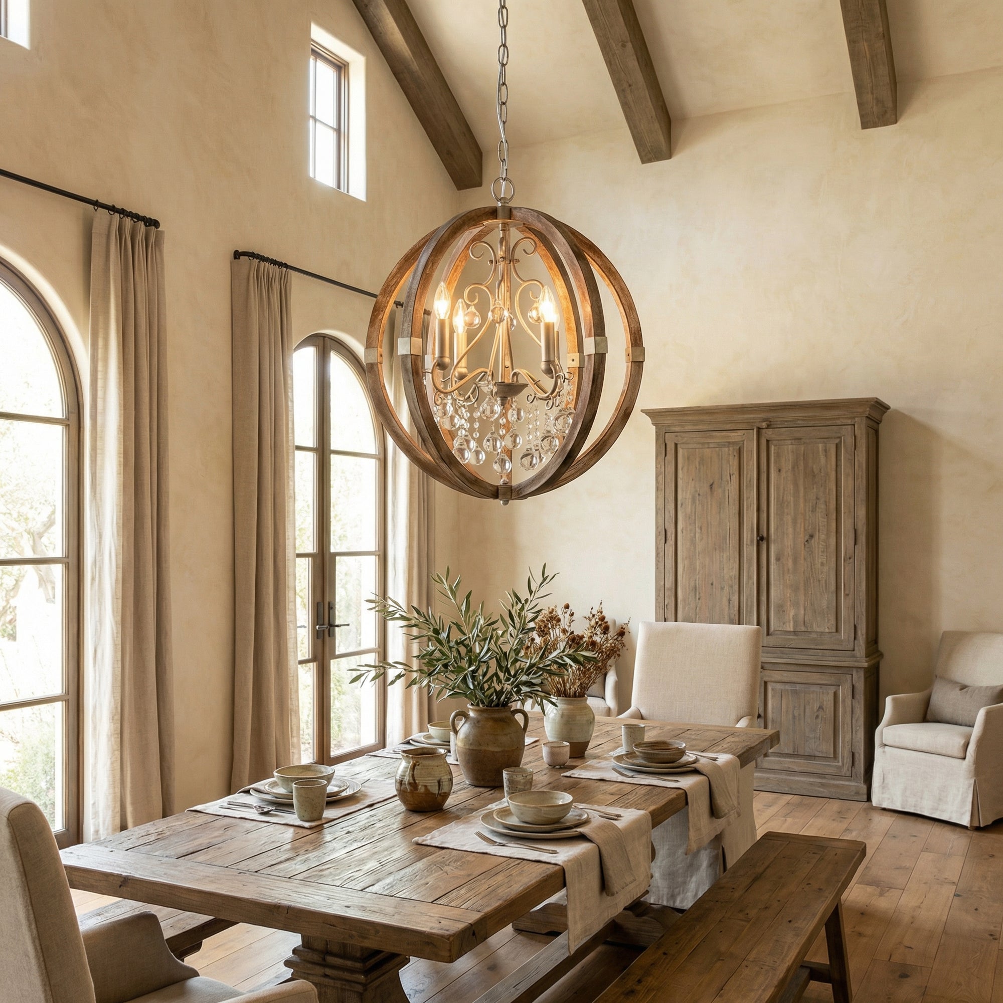 Our wooden pendants balance clean geometry with tactile detail. A turned oak dome steadies a rustic kitchen; a slim walnut cylinder adds focus above a dining table; a wood-and-metal pendant lands perfectly over an island in a loft. Open undersides push task light down while the sides stay softly aglow. Subtle knots, radial grain, and live-edge accents keep every piece unique, pairing easily with butcher-block, limewash walls, or blackened steel.